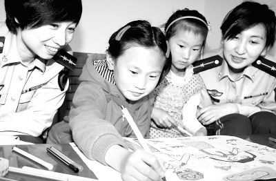 日前,山东日照南湖小学的“春蕾女童”刘彦汐、韩雪在边防检查站民警辅导员的指导下作画。近年来,日照边检站多位女警官不仅资助她们学费,还利用假日为她们补习功课,努力为之营造出快乐成长的良好环境。