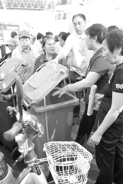 5月15日,北京市朝阳区呼家楼街道的环保一线垃圾分拣员在观看新型环保垃圾箱。
