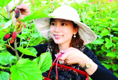 5月17日,浙江省上虞市丁宅乡上宅村农民龚玲娜正在自己创办的舜耕庄园采摘桑果。浙江省上虞市丁宅乡是中国“江南蚕桑之乡”,近年来,这里以“四季仙果”为龙头农业,通过精品采摘、规模效益和休闲观光农业,推进农业增效、农民增收和农村发展。新华社记者 王小川摄
