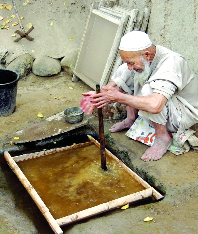 和田地区墨玉县普恰克其乡布达村的吾布力卡斯木,家族六代都是制作桑皮纸的。他说,他的手艺是祖上传下来的。在以前桑皮纸最辉煌的时期,这个村几乎家家户户都会做桑皮纸。吾布力卡斯木说,小时候放学回来看爷爷和爸爸做,长大了,从田地里劳动回来再看看,等爸爸老了干不动了,他自然就接手了,好像天生就会一样。