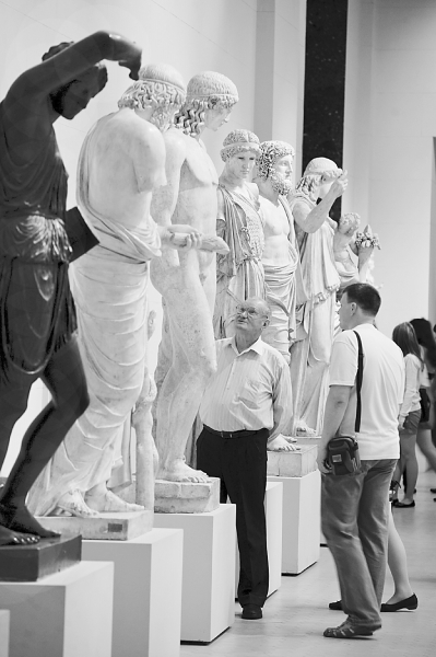 5月18日,参观者们在位于俄罗斯莫斯科的普希金造型艺术博物馆内欣赏雕塑作品。当日是国际博物馆日,免费开放的莫斯科普希金造型艺术博物馆迎来大批市民和游客。馆内珍藏的数千件来自世界各地的古今雕塑、绘画等展品让参观者大开眼界。 新华社发
