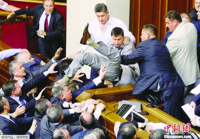 5月24日,乌克兰执政党和反对派在议会发生激烈肢体冲突。焦点是因为乌克兰执政党——地区党提出俄语应具有乌克兰27个州中13个州的地区语言地位,该提案遭到乌反对派的强烈反对,于是,双方在议会上演了“全武行”。