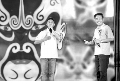 五月二十八日,作为北京人艺建院六十周年纪念活动之一,一台由北京人艺演出的综艺晚会在北京怀柔杨宋镇凤翔露天广场举办,本台晚会体现人艺一贯的追求——到基层去,到人民中去。图为演员杨立新(右)、闫锐演唱京剧《智取威虎山》片段。