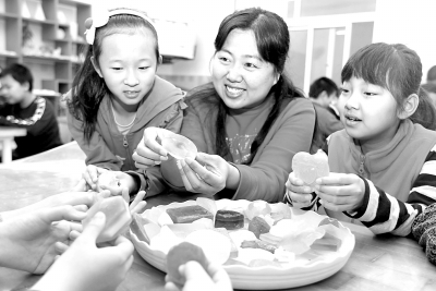 为了迎接“六一”国际儿童节的到来,日前,北京市海淀区中关村第四小学各个课外活动小组开展了文艺演出、手工制作等多项活动,庆祝自己的节日。图为该校老师朱丽华与同学们一起制作彩色香皂。