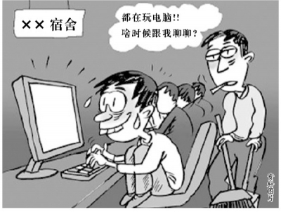 “自从我们寝室每人都有了电脑,同寝室之间唯一的交流就是打游戏的时候。除此之外,没有什么交流。”美术系2010级艺术设计专业学生周嘉俊这样说道。