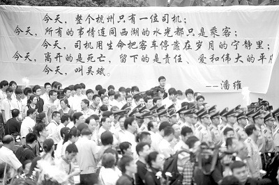 “今天,整个杭州只有一位司机;今天,所有的事情连同西湖的水光都只是乘客;今天,司机用生命把客车停靠在岁月的宁静里;今天,离开的是死亡,留下的是责任、爱和伟大的平凡。今天,叫吴斌。”诗人潘维为吴斌写的诗挂在一张白底黑字的横幅上,格外醒目。