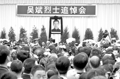 在通往追悼大厅的台阶上,吴斌的同事们站在道路两旁,手执挽联。台阶尽头,黄白色菊花簇拥着几个大字“吴斌烈士追悼会”。