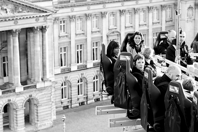 这个由起重机吊起的“空中餐厅”每次可接待22名顾客。该活动将在布鲁塞尔的4个标志性地点相继展开。图为6月4日客人们在距离地面50米的“空中餐厅”享受晚餐。