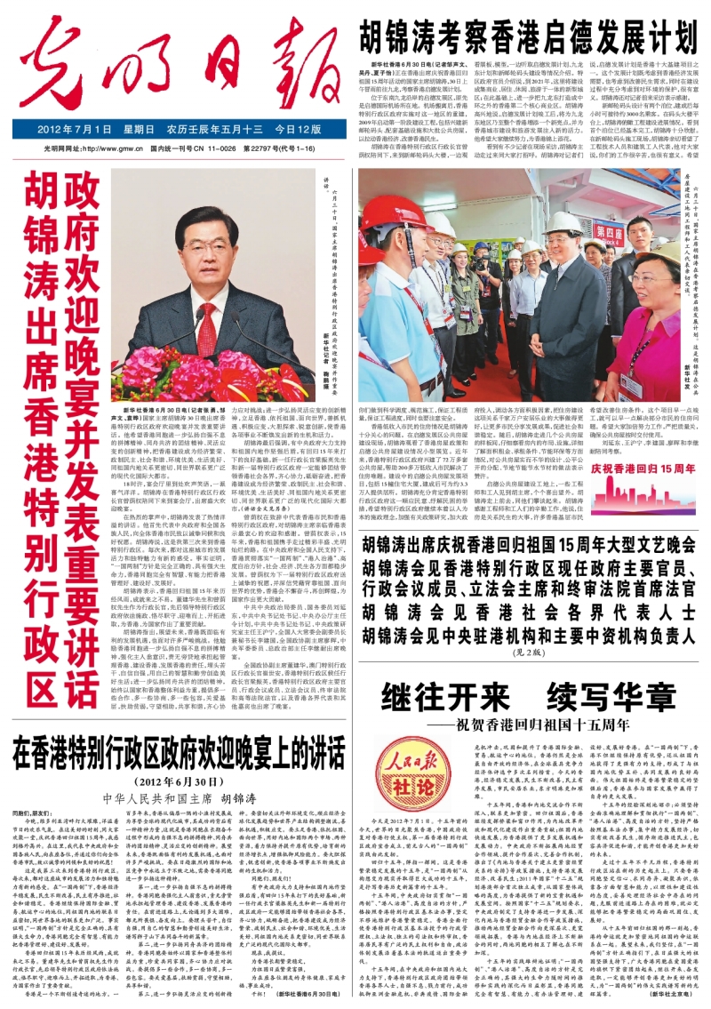 胡锦涛出席香港特别行政区政府欢迎晚宴并发表重要讲话