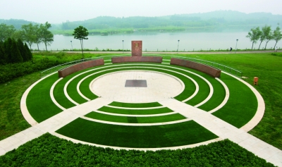 奥林匹克宣言广场是一处开放性公共文化设施,类属于希腊小型广场,其配置绿地离水面仅十余米距离,隔路朝向一片草坡、森林,湖畔绿地随五个同心圆的渐次递进导入其中。主设计师清华大学教授邹文介绍说,广场设计取意中国传统文化中“天圆地方”的概念,用以表现中国文化与奥林匹克文化的结合。
