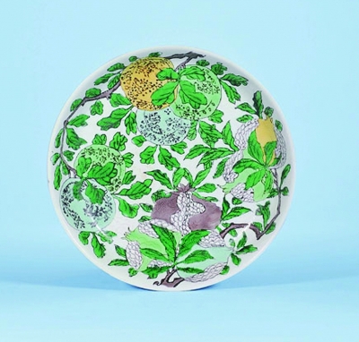 此外,本品纹饰也有其内在意义,石榴象征多子,寿桃寓意多寿,香橼谐音“元”,三者共同组成“连中三元”之意。中国古代科举考试中,称乡试、会试、殿试的第一名为解元、会元、状元;明清殿试前三名为状元、榜眼、探花,亦合称“三元”。“连中三元”是祝愿考生取得佳绩的吉语,形象地运用于瓷器等各类器物之上,在明清时期很受人们的青睐。康熙朝大兴文治,此“连中三元”盘亦是康熙朝开科拔士、偃武修文的表现之一。