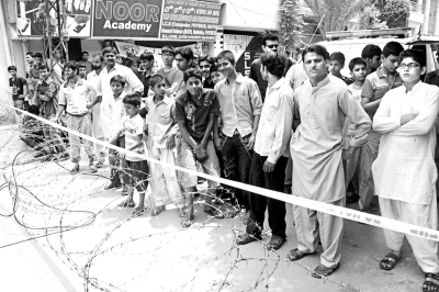 7月12日,市民在巴基斯坦东部城市拉合尔发生袭击的地方围观。据巴基斯坦媒体12日报道,一伙不明身份的枪手当天清晨在巴基斯坦东部城市拉合尔向一处警察住所发动袭击,造成9名警察死亡,另有3名警察伤。新华社发