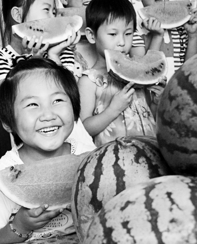 8月7日,山东省博兴县陈户镇官闫村的孩子们在“啃秋”——吃西瓜。当日是我国二十四节气中的“立秋”,我国民间有“立秋啃秋”的习俗,即在立秋这一天多吃西瓜,以防秋燥。本报记者 刘新武摄