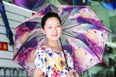 据说,四千年前,一个孩子头顶一片大荷叶,冒雨行走,雨珠从凸面的荷叶斜边上滚下来,这启发人们发明了伞。四千年后,头顶的那片“荷叶”随着纺织业印花技术的发展越来越成熟,各种印刷技艺的发明,使得阴霾下雨天中出现了一朵朵造型各异、颜色缤纷的花朵。这些充满活力的颜色,照亮了那些阴雨天,相信在雨中的大街上,忽然看到一把五彩斑斓的伞出现,一天的心情都会明亮许多吧。