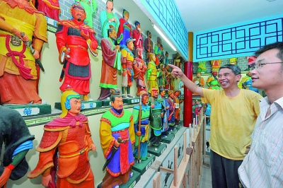 襄阳一老人在自办的“三国人物泥塑馆”为参观者介绍自己的泥塑作品。