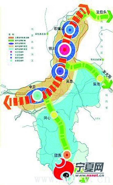 “天下黄河富宁夏”。黄河流经宁夏虽然只有397公里,但其两岸却密集地分布着银川、石嘴山、吴忠、中卫4个地级市和平罗、青铜峡、灵武、贺兰、永宁、中宁等6个县和县级市,是黄河流域灌溉农业和新兴工业最发达的地区之一。这10个城市总面积不到自治区的一半,但却集中了自治区60%的人口、80%的城镇、90%的城镇人口,创造了自治区90%以上的GDP和财政收入。充分利用并发挥这些沿黄城市的资源和优势,建设沿黄城市群、打造“黄河金岸”,以城带乡,城乡统筹,对宁夏乃至全国都有不同寻常的战略意义。