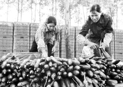 江西省赣州市全南县陂头镇黄塘村两位农妇正在给销往深圳的茄子装箱。该县凭借优越的生态优势和区位优势,做大做强“高山”蔬菜品牌,着力打造粤港澳蔬菜基地。目前,全县已发展蔬菜面积10万亩,产值超亿元。 本报记者 何平摄