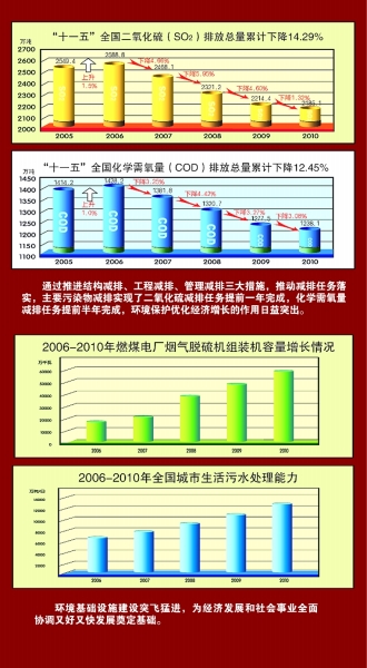 节能减排不仅仅是环保行动,还是调整经济结构、转变发展方式、推动科学发展的重要抓手。为此,我国提出“十一五”单位GDP能耗降低20%左右、主要污染物排放总量减少10%的约束性指标。国务院成立节能减排工作领导小组,发布节能减排综合性工作方案,做出关于加强节能工作的决定,采取强化目标责任、调整产业结构、实施重点工程、推动技术进步、强化政策激励、加强监督管理、开展全民行动等一系列强有力的政策措施,经过艰辛努力,节能减排取得显著成效。“十一五”期间,全国单位GDP能耗下降19.1%,全国二氧化硫排放量减少14.29%,全国化学需氧量排放量减少12.45%,基本完成了“十一五”规划《纲要》确定的目标任务。