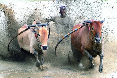 | 赛牛 每年丰收季节,印度尼西亚西苏门答腊省巴东地区都要举办大规模赛牛活动,比赛在水田里进行,场面十分壮观、惊险。 (日常生活类一等奖 驻印度尼西亚使馆钟瑞明摄) |