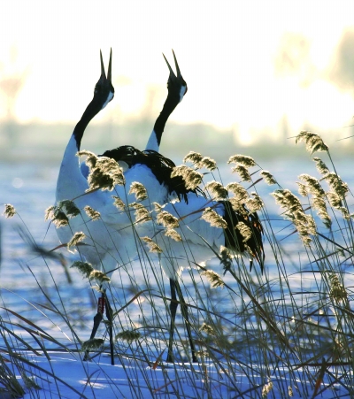 | 高歌 黑龙江扎龙丹顶鹤自然保护区,两只仙鹤朝天而鸣,直冲云霄。(自然风光类三等奖 外交部办公厅天明摄) |