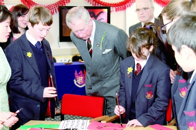 | 汉风渐英伦 英国兰德福瑞公学依托威尔士三一圣大卫大学孔子学院设立的孔子课堂举行揭牌仪式,英国王储查尔斯王子饶有兴致地观看学生们学习中国书法。 (外交纪实类优秀奖 驻斯洛伐克使馆何钧摄于英国) |
