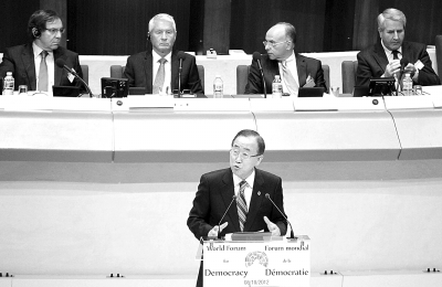 10月8日,联合国秘书长潘基文在法国斯特拉斯堡出席欧洲委员会主办的首届“世界民主论坛”开幕式时发表讲话。潘基文对最近叙利亚和土耳其边境发生的炮击事件深表担忧,认为叙土边境冲突升级将造成“非常严重的后果”。 新华社记者 刘绍平摄