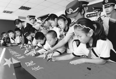 近日,青岛沙子口边防派出所干警来到某特殊教育学校看望孩子们。 新华社记者 李紫恒摄
