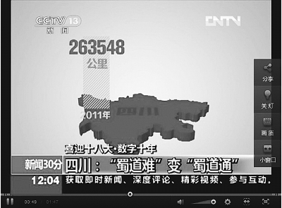 从8月21日开始,中央电视台在《新闻联播》、《新闻30分》、《朝闻天下》等栏目中,推出了《数字十年》系列节目。这是中央电视台十八大宣传的一个重点节目,也是我们创新报道形式的一个新亮点。节目一经播出就得到了观众的好评,网上点击率数以百万计。《数字十年》的一个最大特点,就是巧妙地赋予一个个抽象的数字以具象化、人性化、故事化的鲜活形态,用小数字、小图表、小细节折射大变化、反映大主题、彰显大时代。
