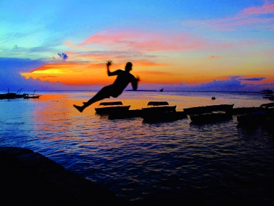 日落时分,彩霞灿烂。坦桑尼亚的桑给巴尔海滨一派热闹景观,人们纳凉海岸、戏水江边。在一个叫“风吹月牙”的餐馆前,我趁着等待晚餐的时机,把镜头对准水面上叠罗汉、扎猛头的人们,细看观察大多为青少年,见我对他们有兴趣拍摄,几个小家伙跳水的劲头更足,跳一次,爬上岸看我相机的图样后又兴奋地再跳。最初我把背景对在水面上,后来发现逆光的天空红霞泛起,船与帆静态水面。此刻,几个少年又兴高采烈地跃向大海,我也激动地按下快门,定格了这幅飞天的场景。