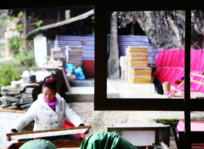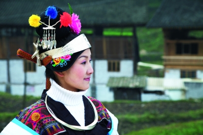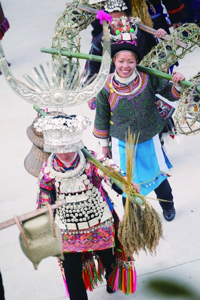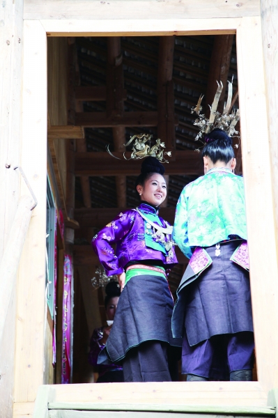 十二月的一天,我们走进贵州黔东南,来到丹寨县,就被这微笑感染了。那身着盛装的苗族姑娘们正翩翩起舞,芦笙欢快,舞步优雅。当节奏越来越快,只见银饰闪烁、哗哗作响,花带飘逸、跃跃欲飞,舞者脸上绽放出阳光般的微笑,脚步轻松,宛若锦鸡亮翅,统一的“彩绣百褶超短裙”使她们在浓厚的传统氛围中显出时尚的味道。这便是丹寨极富盛名的“锦鸡舞”,我们忍不住跟着跳了起来。