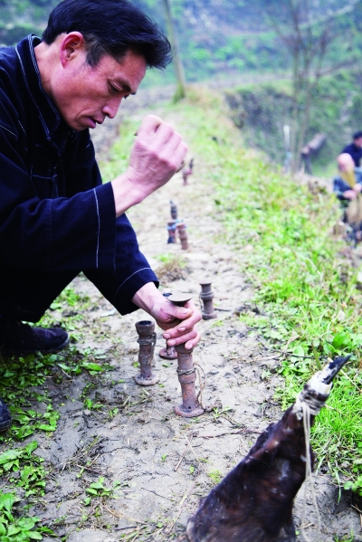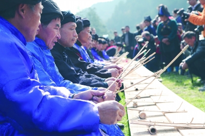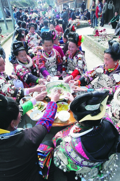 其实,这“时尚”的超短裙本就是苗族传统服饰的一种,丹寨境内有多个苗族支系,仅苗族服饰就有八种。第二天便是苗族古老的传统节日——祭尤节,四邻八乡的苗族村民,穿上节日的盛装,早早地来到长青乡扬颂村。当地人告诉我们,通过服饰的差别,可以区分不同的苗族支系。隆重的仪式过后,人们在芦笙的引领下,载歌载舞,庆祝美好的年景。炊烟袅袅,各家已经在为宾客准备午餐了。歌罢舞罢,众人欢聚于池塘边的长席,“喀-嗞-噢”,欢呼过后,举杯动筷,好不热闹!