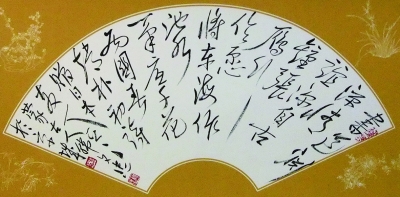 韩的狂草创作,既有怀素狂草书艺的底蕴,又有他自己独创的时代新风,从而勃发为中国书法艺术园地的一朵难得的狂草新葩。怀素《自叙帖》中那种如“飞鸟出林”和“惊蛇入草”的神韵,那种“笔下唯看激电流,字成只畏盘龙走”的气魄,那种惊天地泣鬼神的大写意精神,都为韩文忠的书艺创作所吸纳。如果说“文如其人”,那么书艺作品也如其人,韩的书法里又映射出他内心世界的色彩。韩先生自幼生长在广阔的科尔沁草原,居所毗邻科尔沁王爷庙。那里的生活,可谓“天地神人四位一体”,堪称诗意的栖居,滋润和催生了韩先生那率真的艺术灵性。