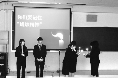 日本北九州市立大学的学生社团“中国语言文化研究会”日前举行了一年一度的“蜡烛精神”传递仪式。该校“中文会”的同学比照“燃烧自己,照亮别人”的蜡烛,不计个人得失、甘于奉献,每年为承办“五星奖”中文比赛、推广汉语学习作出贡献。图为二年级学生向新入会的一年级同学传递蜡烛。叶言材摄