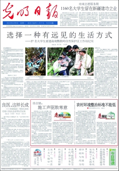 首篇报道:4月9日《光明日报》头版头条发表《选择一种有远见的生活方式——27名大学生重建海南鹦歌岭自然保护区工作站纪实》,后续报道75篇。