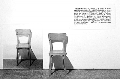 约瑟夫·孔苏思的作品《一把椅子和三把椅子》是当代观念艺术最重要的代表作之一。作品由三个部分并置起来:一把真实的椅子、一张椅子的照片和一张印着辞典上对“椅子”一词解释的招贴。实存的物品、照片和辞条解释,以物、拟象、语词三种不同的形式显现指向了同一事物:椅子。