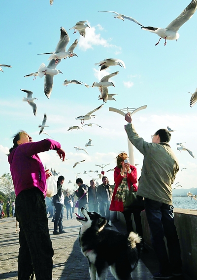 12月26日,游客在滇池边喂食红嘴鸥。经统计,今年飞抵昆明越冬的红嘴鸥数量达到35000多只。
