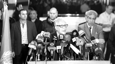 12月27日,在叙利亚首都大马士革,联合国-阿盟叙利亚危机联合特别代表卜拉希米(中)在记者会上介绍此次外交斡旋成果。卜拉希米本月23日抵达大马士革,开始对叙利亚进行年内的第三次访问,并在24日同叙利亚总统巴沙尔举行会谈。他在会见巴沙尔后对媒体表示,叙利亚的状况依然令人担忧,希望各方都向着叙利亚人民期待的方向前进。 新华社发
