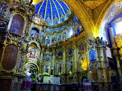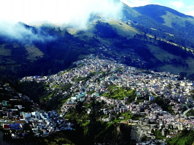 抵达厄瓜多尔首都基多已是傍晚时分,天空飘着细柔的雨丝,空气中透出几分初冬寒意,2800多米的海拔让人觉得天空似乎触手可及。基多是16世纪在印加城的废墟上建立起来的,面积不大却是拉丁美洲保存最完好的历史中心,也是世界文化遗产。整个老城依山而建,街道狭小起伏,将许多小广场和教堂连接。街道边的房屋仅凭剥落的墙皮就知道已经有了相当的历史,但印加人用鲜明的色彩赋予房屋灵动的生命力,耀眼的黄、宁静的蓝、热情的红,那色彩就这么流淌到人们的眼前。