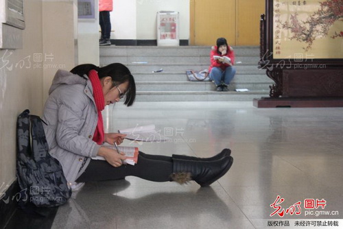 1月10日,在山东聊城大学,大学生正在全力以赴备考期末考试。近期全国各大高校相继进入期末考试周,在现行的高校考试制度下,大学生将在这短暂的考试周将一学期学习的各科知识迅速复习背诵记忆来应对期末考试,不少同学称其复习时间短、科目多、任务重,强度不亚于考研,不少大学生早起晚归,疲于应战。大学考试周被学生戏称为“黑色大学日”。徐国旺摄/光明图片