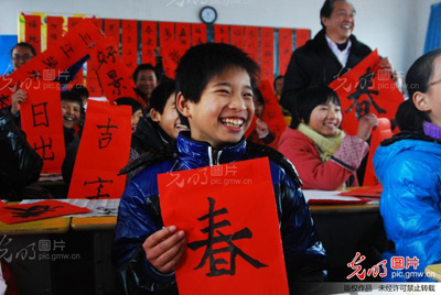 1月10日,浙江省建德市大同第二小学书法社团开展以“秀出书法 展示才艺”为主题的民俗文化迎新年活动。50多名爱好书法的学生有的写“福”字,有的写“春”字,有的写起了春联,为临近的春节增加喜庆气氛。