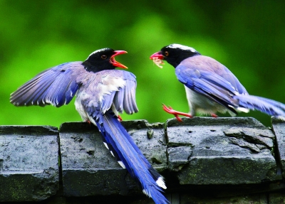 2012年5月下旬的一个下午,我在浙江台州括苍山麓深处的小山村采风,忽然,溪旁水杉树处传来一对红嘴蓝鹊高亢花腔般的鸣叫声。随后它们一前一后拖着长长的尾巴,优雅地落在屋顶青瓦上,戏耍、梳理羽毛,用特有的形体语言演绎着它们的爱情故事……