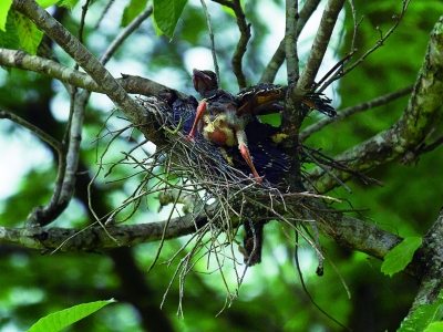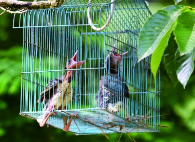 5.一夜之间,鸟巢被毁。村民把在树下寻到的两只雏鸟放进大鸟能进出的鸟笼里,将鸟笼挂在原来鸟巢下的树枝上,以期大鸟来喂养。两只雏鸟在鸟笼中焦急地等待着。
