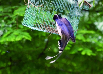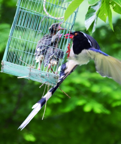 6.鸟妈妈回来了,扒着鸟笼欢快地给两只雏鸟喂食。