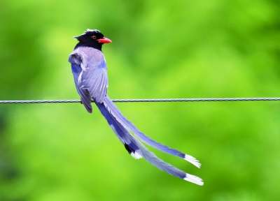红嘴蓝鹊,属鸦科,是江南常见的一种鸟,体态优美,尾羽长而秀丽,尾端白,红嘴、红脚,仪态庄重、雍容华贵,由雌雄亲鸟轮流孵化,共同育雏;其鸣叫声粗野喧闹,响彻山间;喜欢群栖,常活动于山地的针叶林、阔叶林或针阔混交林,以及山区溪流的灌丛和竹林间。