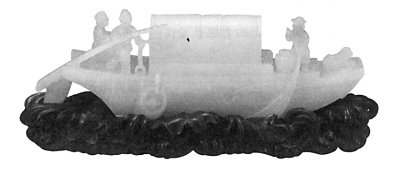 这个玉件是个船的造型,底下用紫檀木雕的是浪花(图2)。船在古代是一种非常好的交通工具,舒适度远远高于骑马和坐车。古人经常在船上发思古之幽情,写点诗歌,船就成了古代非常重要的交通工具。但船有一个局限性,必须得有河流,所以古代南方的交通主要依靠船。我们古代的船是无动力、不污染的,主要靠人工摇橹、撑篙,但它的行进速度是比较缓慢的。现在所有的大江大河上面都有桥,开着车很快就过去了。过去是不可以的,过去都是小河上才建桥,大河建不了桥,在这种情况下都靠渡口摆渡。不管是徒步,还是有车、有马,都要通过渡口来摆渡。这样行进速度就受到了一些限制,而且万一要是涨水,或者风浪大,就很危险。从某种意义上讲,今天的行进速度虽然快,但更加危险,稍不注意就有可能发生交通事故,国家每年在交通安全上投入的经费是非常大的。