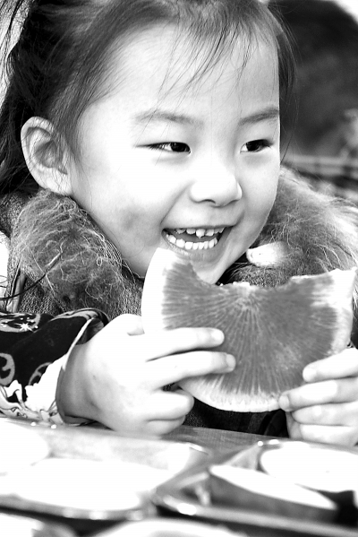 2月4日,在山东南部的枣庄市,枣庄实验幼儿园的小朋友在吃生萝卜“咬春”。当日是二十四节气中的“立春”,鲁南地区有吃生萝卜“咬春”,迎接春天到来的习俗。 新华社发(孙中喆 摄)