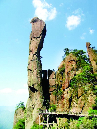 巨蟒出山 位于江西三清山女神峰附近的一座山谷中,只见一花岗岩石柱拔地而起,高128米,状如一条巨大的蟒蛇横空出世,昂头直刺青天,蟒头、蟒身惟妙惟肖,实乃天工造化。传为巨蟒因犯戒被罚为石身,永远镇守在峡谷中,是三清山著名的景观。