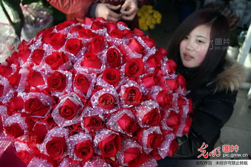 2013年2月13日,山东聊城一家花店的工作人员在赶制玫瑰。今年情人节恰逢大年初五,山东聊城不少花店的商户放弃春节休假,纷纷赶制和销售玫瑰,在浓浓年味中感受玫瑰香带来的商机。孔晓政摄/光明图片