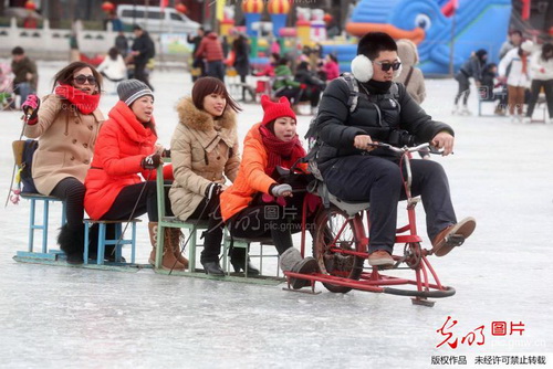 春节期间,来自全国各地的游客在北京什刹海冰面上滑冰车。陈晓根摄/光明图片