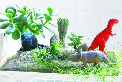 自制盆景很简单,果盘一个,泥土一堆,江边拾石块三粒,公园拾的小石子一把,玉树一小枝,雀舌一小枝,仙人球一柱。玉树、雀舌、仙人球栽植成活率极高,且生长缓慢。盆景的布置因人而异,当然盆景的造型,也是一个人的智慧与情趣的反映。当你将平时看上去没有用的东西,拼接为一盆,顿时便有了一种“化腐朽为神奇”的感受。瞧,咱这盆“恐龙世界”,能不能让你浮想联翩?